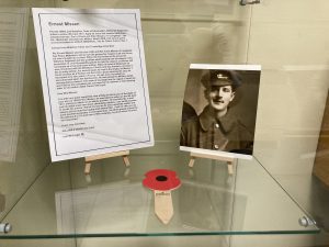 One cabinet features a photo of Private Ernest Missen, who was killed on 9th April 1917, and another highlights Gunner Claude Merchant, who was killed on 10th January 1945.